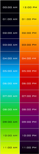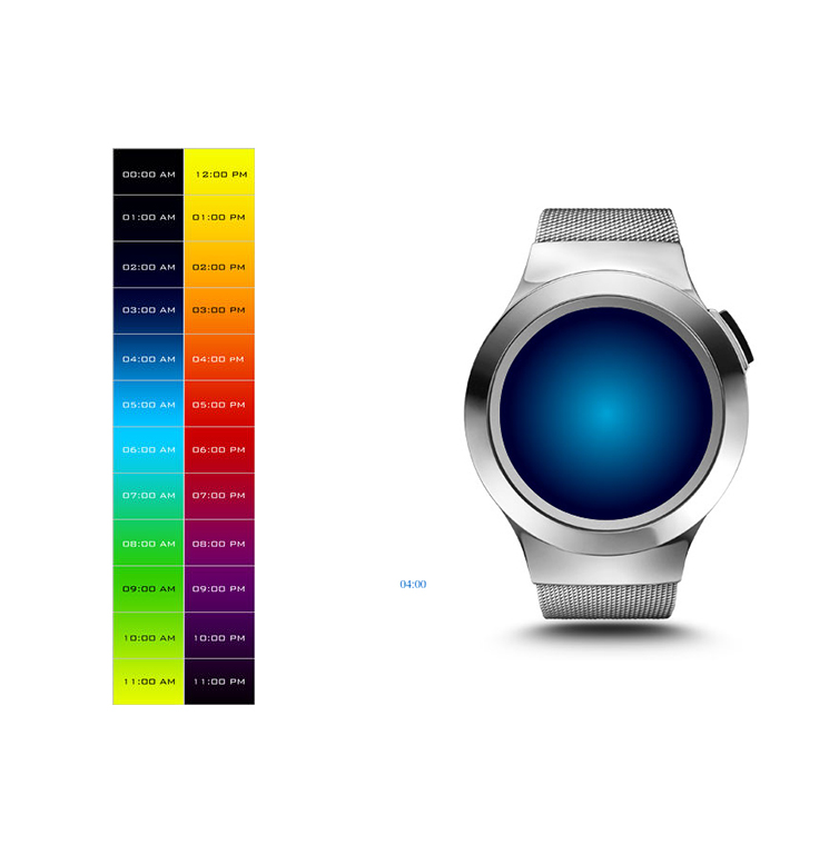 Until today the colorclock is only a conceptual work and converts time in different colorgradients. The colors are adjusted to the typical colors of a day. For example: on highnoon when the sun reaches the highest point the color turns to yellow .